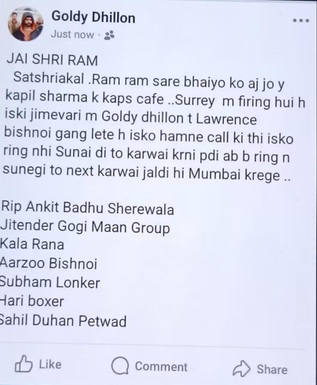 Goldy Dhillon, a gangster allegedly linked to the Lawrence Bishnoi gang, posted online, claiming responsibility. He said they had called Sharma but got no reply, so action was taken. He said that Kapil’s invitation to Salman Khan for his show’s opening episode may be linked to the recent attacks.