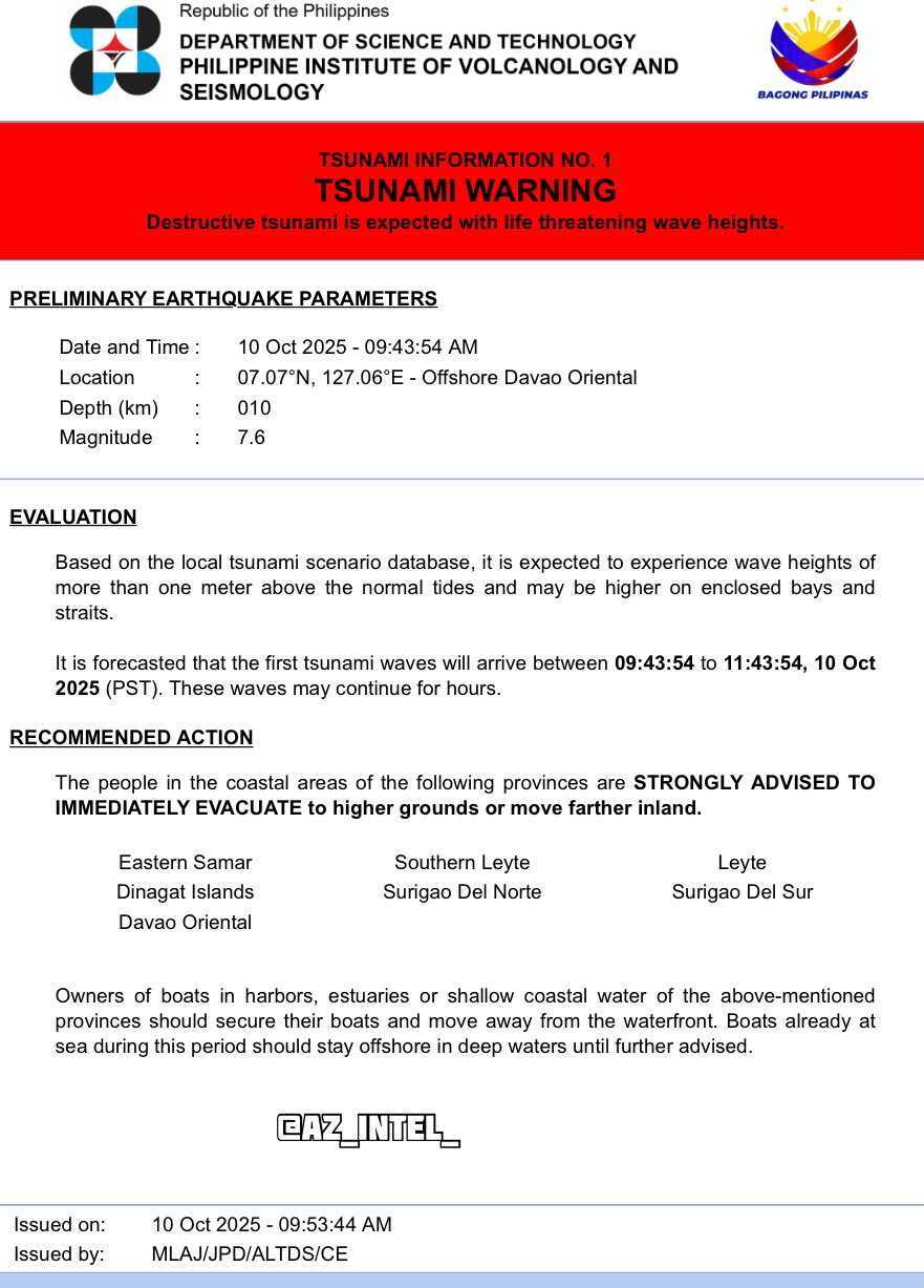 A strong Philippine earthquake measuring 7.5 struck off the coast of Manay town in Davao Oriental, Mindanao, on Friday. Authorities issued a tsunami warning and asked residents in coastal areas to move to higher ground. The alert has now been lifted. At a depth of 20 km, the quake prompted evacuations in Davao City, where schools were cleared. Officials continue to monitor aftershocks and assess damage to homes and public buildings.