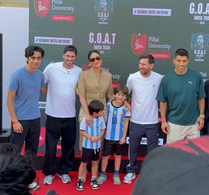 Lionel Messi’s Mumbai visit during his India tour created major buzz across the entertainment and sports world. The global football icon was seen meeting several Bollywood celebrities, making the event one of the most talked-about moments. Shah Rukh Khan, Kareena Kapoor Khan with their kids and Ajay Devgn, Sachin Tendulkar were among the prominent film stars present at the Mumbai event. The meet-and-greet quickly grabbed attention as pictures and videos of Messi with Bollywood celebrities went viral on social media.