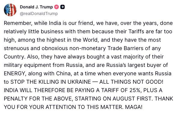 US President Donald Trump has announced a 25% tariff on Indian goods starting August 1, along with an additional penalty. He said the decision is based on India’s continued oil and military purchases from Russia during the Ukraine war. Trump, in a post on Truth Social, called India a friend but claimed trade between the two countries has been limited due to India’s high tariffs and strict trade rules. He warned that these actions come at a cost.